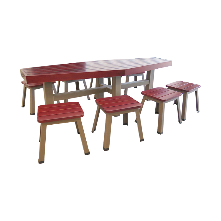 This steel-and-wood table and chair set combines practicality with aesthetic appeal. In terms of materials, the steel frame is robust and durable, capable of bearing substantial weight without deformation or damage over extended use. The wooden tabletop offers a warm, tactile feel, enhancing comfort and natural texture during use. The rational structural design features an integrated table-and-chair unit, saving space and facilitating easy movement. Suitable for public areas such as factories and campuses, it accommodates multiple occupants simultaneously, providing a convenient and comfortable experience for employee breaks or impromptu discussions.